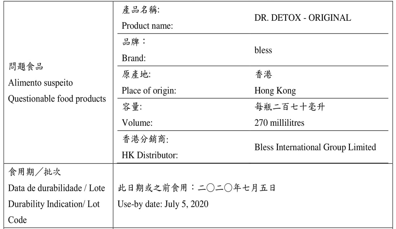 市政署透過恆常食品事故監察系統,獲悉香港食物安全中心公佈,於一個香港生產的果汁飲品樣本中驗出含十億分之六十三的展青霉素。涉事產品名稱為「DR.DETOX-ORIGINAL」,品牌是bless,原產地為香港,香港分銷商為Bless International Group Limited,容量是每瓶二百七十毫升,此日期或之前食用:二○二○年七月五日。