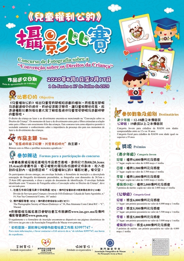 由社會工作局主辦、澳門攝影學會協辦之《兒童權利公約》攝影比賽將於6月1日起接受作品提交,歡迎市民踴躍參與。