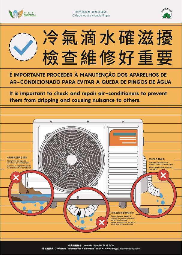 冷氣機滴水問題不但滋擾他人,亦容易造成蚊患以及滋生青苔,破壞公共環境衛生。冷氣機滴水的成因有很多,包括排水喉管沒有妥善接駁、鬆脫、破裂或機件自然老化等,如發現以上情況,居民應尋求專業冷氣技師上門檢測及進行維修。根據《公共地方總規章》規定,冷氣機滴水可被科處罰款六百澳門元。
