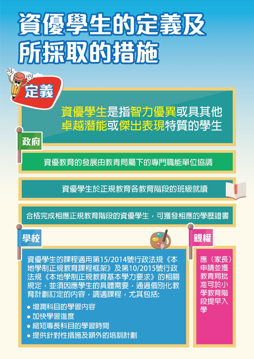 法規同時對資優學生作出定義,規定資優學生於正規教育各教育階段的班級就讀,且規範了資優學生的課程、證書,以及資優教育的發展。
