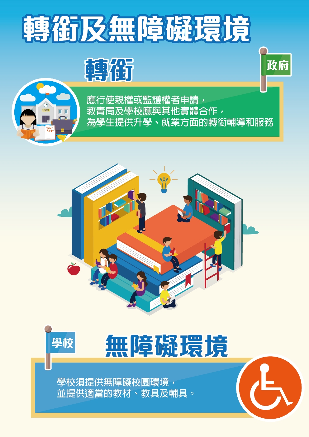 應行使親權或監護權者申請,政府及學校應與其他實體合作,為學生提供升學、就業方面的轉銜輔導和服務。為使有身心障礙的學生能夠學習順利,學校須提供無障礙校園環境,並提供適當的教材、教具及輔助工具。政府將向實施特殊教育的私立學校和提供與特教有關服務的私人實體提供財政支援。