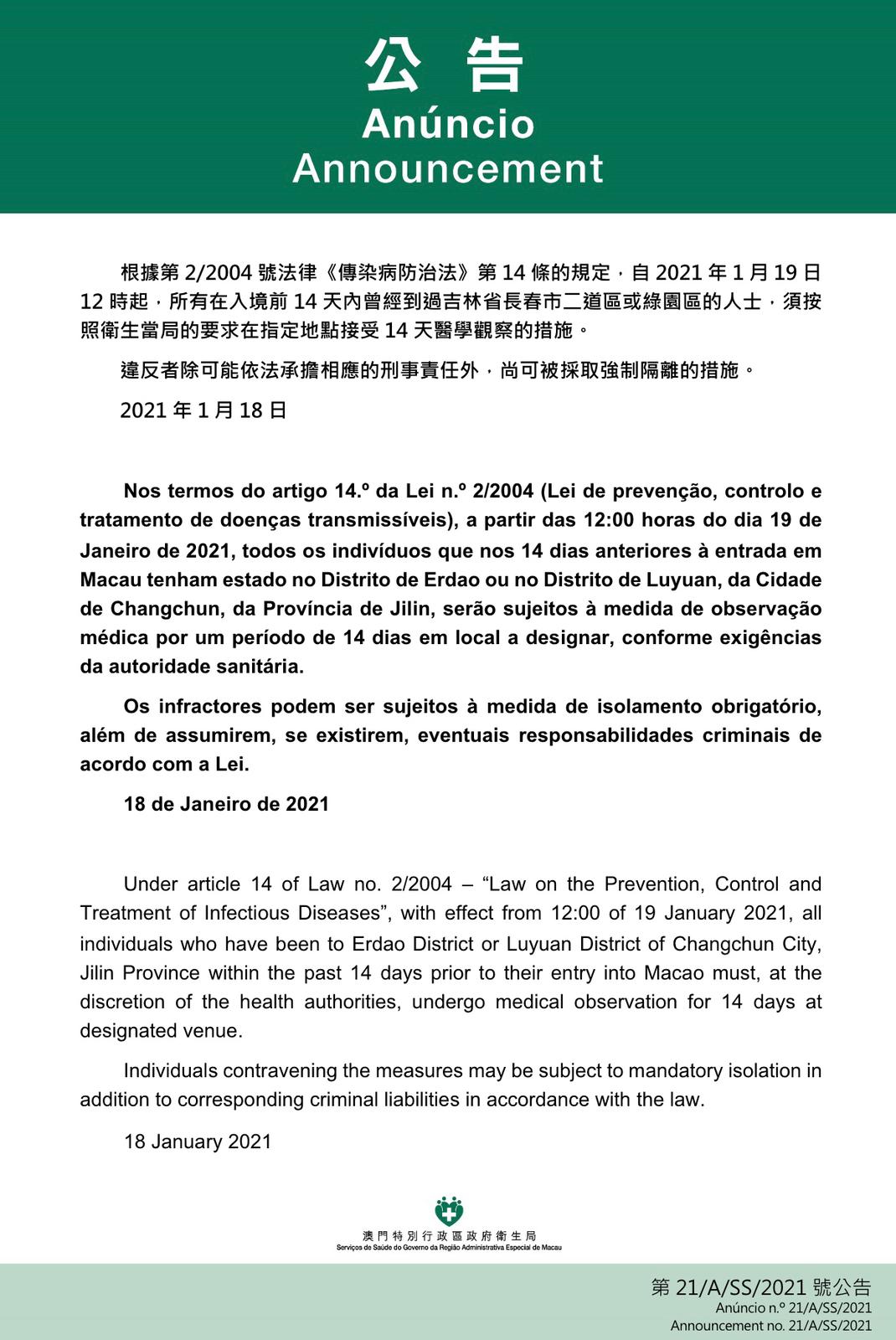 新型冠狀病毒感染應變協調中心宣佈,因應河北省及黑龍江省的最新疫情發展,衛生局根據第2/2004號法律《傳染病防治法》第14條的規定,自2021年1月19日12時起,所有在入境前14天內曾經到過吉林省長春巿的二道區、綠園區或北京市大興區天宮院街道的人士,須按照衛生當局的要求在指定地點接受14天醫學觀察,違反者除可能依法承擔相應的刑事責任外,尚可被採取強制隔離的措施。