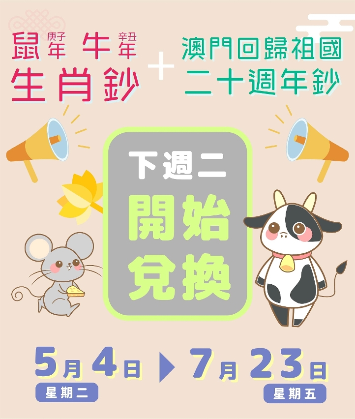 鼠年、牛年生肖鈔,及澳門回歸祖國二十週年鈔的網上預約登記,早前已經順利完成,各參與銀行將於下週二(5月4日)起提供兌換服務。