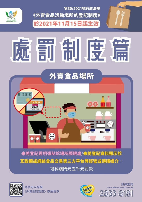 第30/2021號行政法規《外賣食品活動場所的登記制度》已於2021年11月15日生效,違反登記制度的相關規定,可被科處五千至三萬五千澳門元罰款。不論外賣店或是網絡食品交易第三方平台負責人,須瞭解登記制度的有關要求,守法經營。