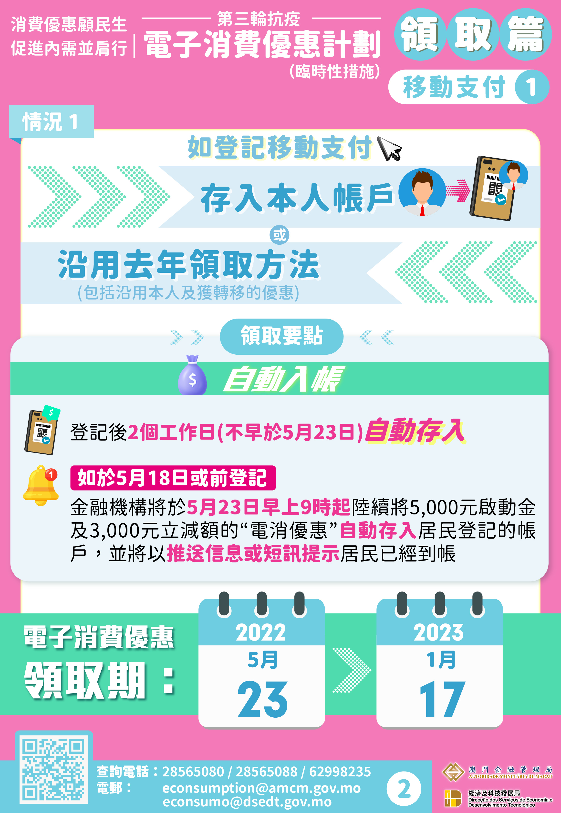 於5月18日或之前完成登記選擇“移動支付”的居民, 金融機構將由9時起陸續自動注資及通知到帳;如選擇“消費卡”居民則可拍卡領取優惠,約3秒完成加值,必須注意於拍卡前,要將卡內餘額用至10澳門元或以下。