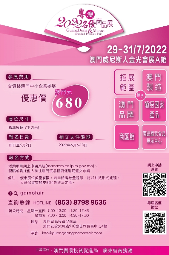 由澳門貿易投資促進局、廣東省商務廳合辦的“2022粵澳名優商品展”將於7月29至31日假澳門威尼斯人金光會展A館舉行。為加強粵澳經貿合作、助力企業推廣品牌,展覽今年將持續鼓勵符合條件的本地中小企以優惠價680澳門元參展,歡迎感興趣的企業於即日起至6月2日報名。