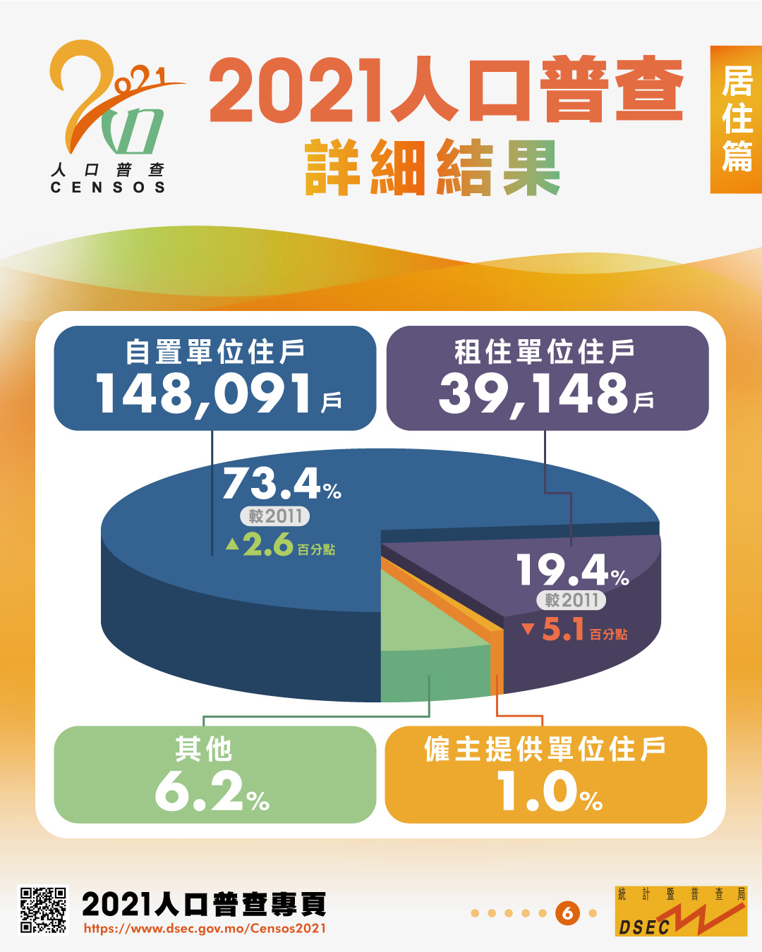 居於自置單住(單位屬住戶成員物業)的有148,091戶,佔住戶總數73.4%,較2011年增加2.6個百分點;而租住單位的住戶比例則較十年前減少5.1個百分點,共有39,148戶。