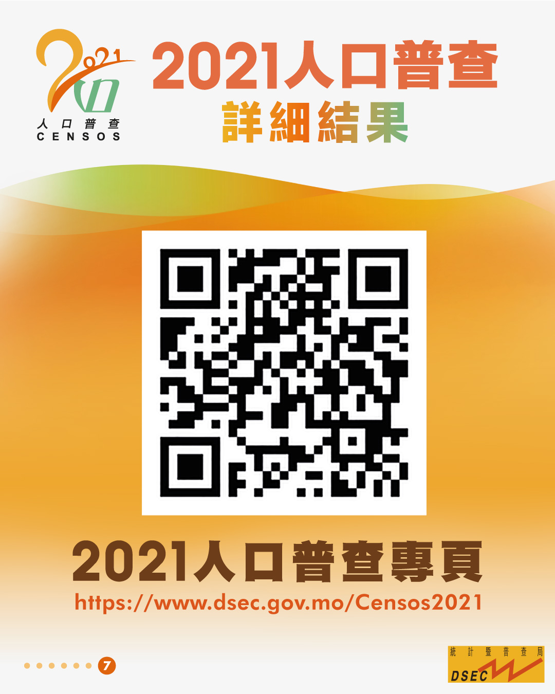 為收集詳細的人口數據,統計暨普查局於2021年8月進行了第16次人口普查及第6次住屋普查;繼去年底公佈了2021人口普查初步結果後,現公佈《2021人口普查詳細結果》報告,並同時在網頁推出「統計地理資訊系統(GIS)」及「人口數據資料庫」兩個查詢工具,方便市民迅速查找人口資料。