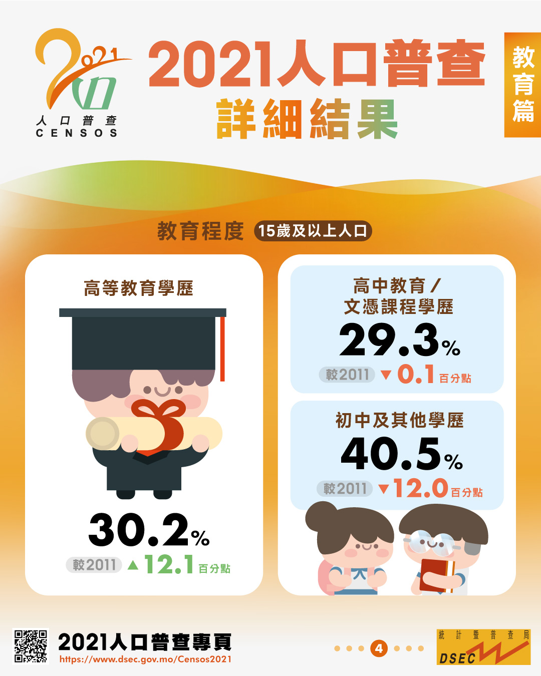 過去十年整體人口的學歷有所提升。2021年年齡在15歲及以上人口中擁有高等教育學歷的比例為30.2%,共175,956人,較十年前增加接近一倍(+99.9%);完成高中教育/文憑課程的佔29.3%,擁有初中及其他學歷的佔40.5%。