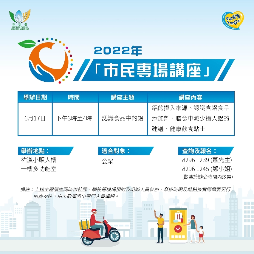 含鋁的食品添加劑被廣泛用於烘焙、蒸點等食品中,目的使麵糊達致膨脹及鬆軟的效果。為讓市民了解含鋁食品的安全食用原則,並建立科學理性的食安觀念,市政署將在六月十七日下午舉辦“認識食品中的鋁”市民專場講座。講座費用全免,歡迎市民踴躍報名參加。