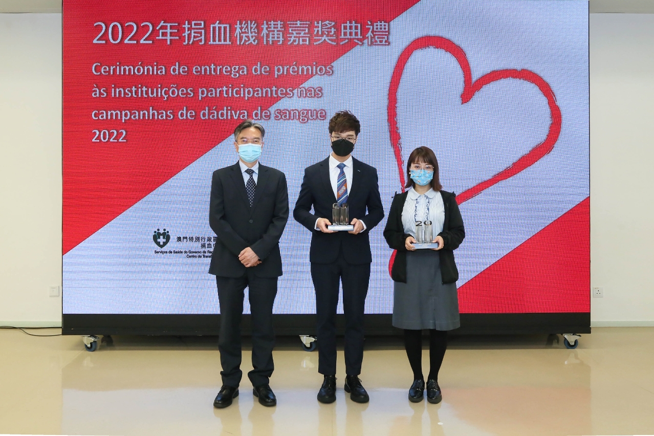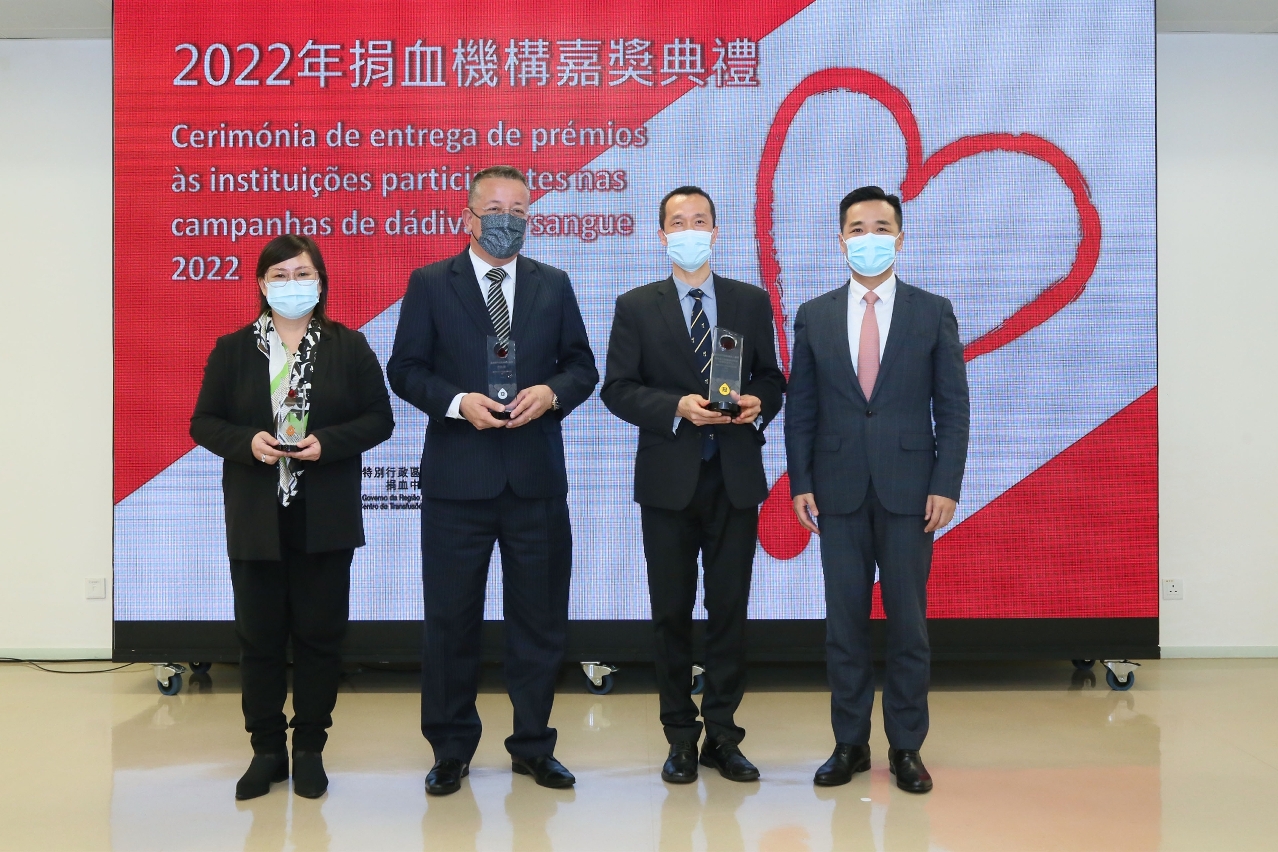 衛生局今(15)日舉行了2022年“世界捐血者日”系列活動之“捐血機構嘉獎典禮”,衛生局羅奕龍局長、郭昌宇副局長、鄭成業副局長、陳永華副局長、教育及青年發展局林文達廳長及捐血中心許萍主任出席了典禮,並向各獲奬機構代表頒發相關奬座,以感謝他們對維持本澳充足血液供應所作出的貢獻。