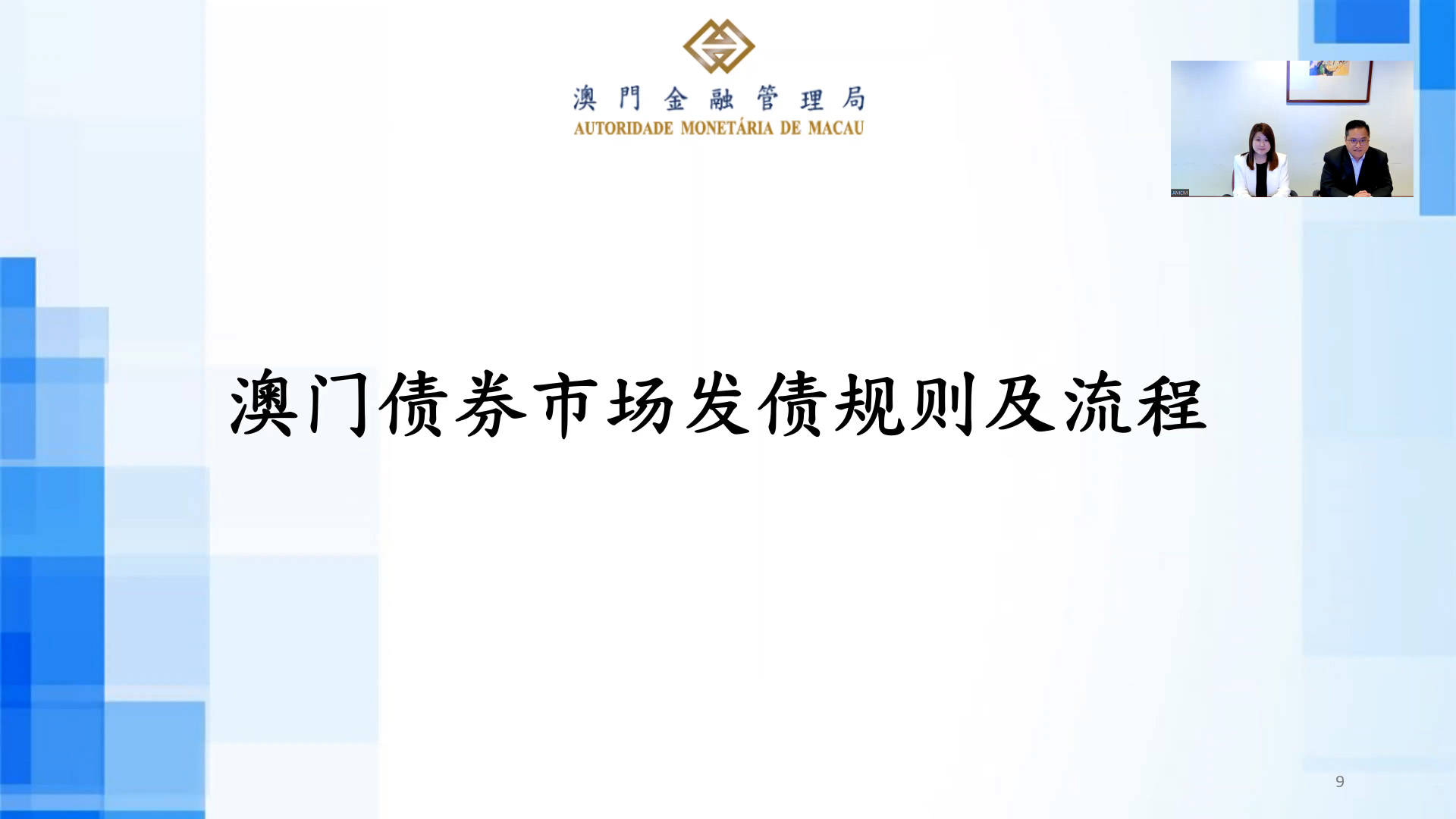 隨後,澳門金管局代表介紹澳門債券市場基本情況,並講解在澳門發行債券的具體要求、申請程序及審核流程等。截至2022年5月,在澳門發行或掛牌上市的未到期債券共有109隻,涵蓋金融債、公司債、綠色債券等債券品種,存量金額逾3,000億澳門元。
