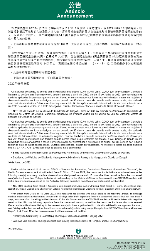 新型冠狀病毒感染應變協調中心(下稱應變協調中心)宣佈,因應內地的疫情變化,衛生局根據第2/2004號法律《傳染病防治法》第10條和第14條的規定,自2022年6月17日凌晨1時起,所有曾經到過以下地點的入境及已入境人士,須按照衛生當局的要求在指定地點接受醫學觀察至離開當地後10天,但最短不少於7天,並在離開當地後14天當天再接受1次新冠病毒核酸檢測結果為陰性後,才可經澳門前往中國內地: