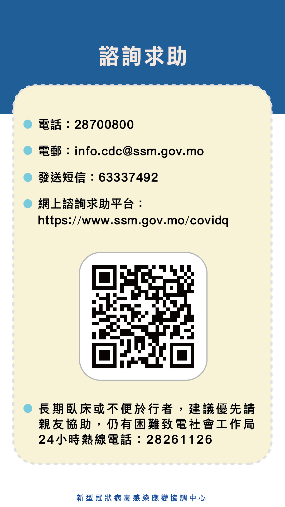 新型冠狀病毒感染應變協調中心表示,居民如對防疫工作有諮詢或求助,可透過電話(2870 0800)、電郵(info.cdc@ssm.gov.mo)、發短信至6333 7492、網上諮詢求助平台(https://www.ssm.gov.mo/covidq),作出諮詢或求助。長期臥床、嚴重病患且不便於行的人士,建議優先請親友協助,仍有困難者,可致電社會工作局24小時熱線電話2826 1126尋求協助。