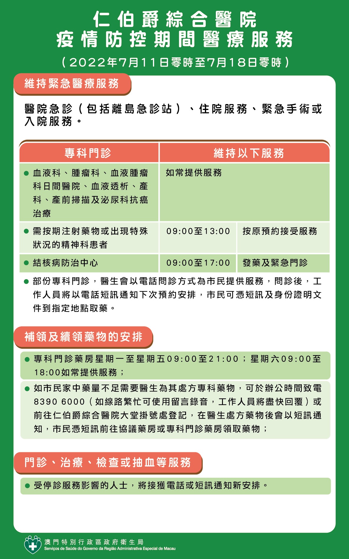 為防止新型冠狀病毒在澳門的傳播風險,自2022年7月11日零時至7月18日零時,所有從事工商業活動的公司、實體及場所暫停營運。疫情防控期間,仁伯爵綜合醫院、衛生中心/站的醫療服務、補領及續領藥物等相關安排如下: