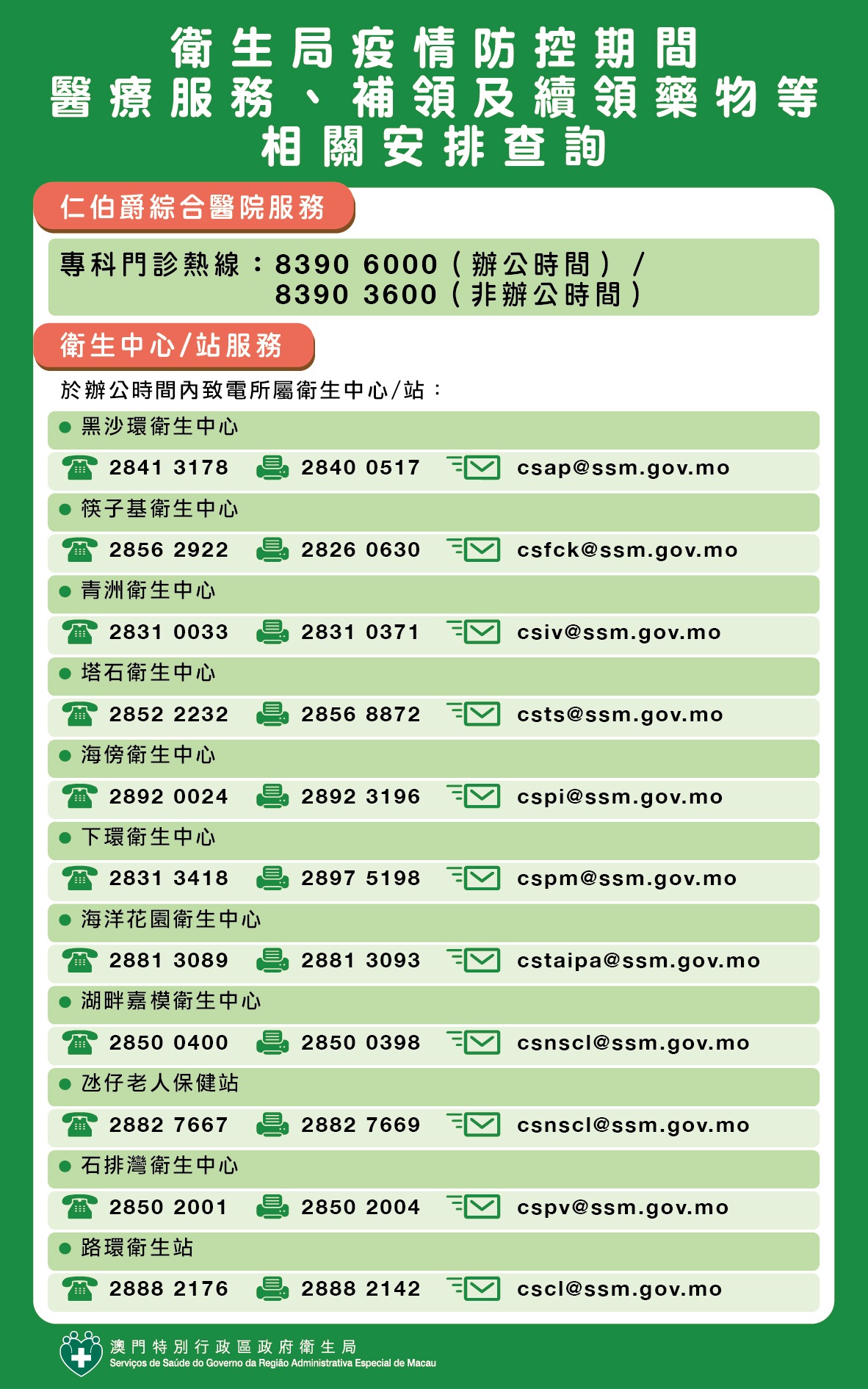 電話: 2850 0400 圖文傳真:2850 0398 電郵:csnscl@ssm.gov.mo;