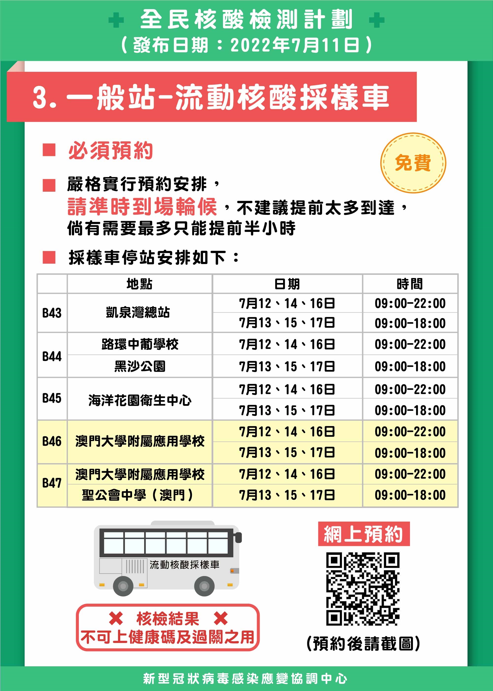 新型冠狀病毒感染應變協調中心(下稱應變協調中心)表示,為進一步便利一些地區的居民進行核檢的需要,由第8輪全民核檢(7月12日至13日)開始,將增設2輛流動核酸採樣車停泊在澳門大學附屬應用學校及聖公會中學(澳門),居民可於明(12)日早上7時起透過全民核酸預約系統(https://eservice.ssm.gov.mo/allpeoplernatestbook )進行預約,停站時間安排如下: