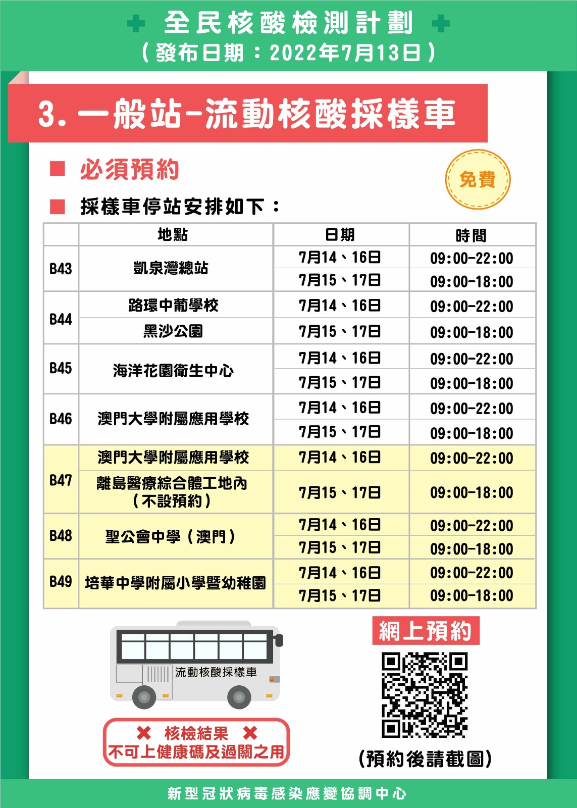 新增2輛流動核酸採樣車的停站安排:第1輛(B48)停泊在聖公會中學(澳門)(氹仔海灣圍);第2輛(B49)停泊在培華中學附屬小學暨幼稚園(氹仔米利奧街93號),2輛流動核酸採樣車的運作時間由7月14日上午9時至晚上10時,7月15日上午9時至下午6時。此外,調整B47流動核酸採樣車的停泊位置,7月14日維持停泊在澳門大學附屬應用學校,供市民預約採樣,7月15日停泊在離島醫療綜合體工地內,供在該工地內住宿的相關人員採樣,不設預約。