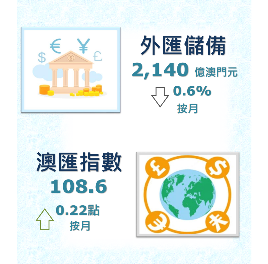 澳門金融管理局今日公佈,2022年6月底澳門特別行政區的外匯儲備資產總額,初步統計為2,140億澳門元(264.8億美元),較2022年5月經修訂總額2,154億澳門元(266.5億美元),下降了0.6%。2022年6月底的外匯資產總額,約相當於2022年5月底澳門流通貨幣的11倍或廣義貨幣供應(M2)中屬於澳門元部份的85.8%。