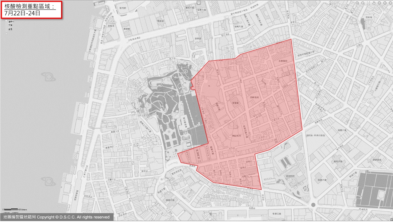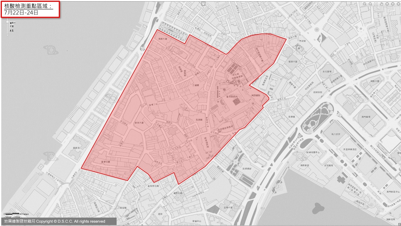 新型冠狀病毒感染應變協調中心公佈,經分析本澳近日多個社區發現的個案,不排除在他們居住大廈附近有傳播,為此,針對重點區域進一步開展核酸檢測,以排除可能潛伏於本澳社區的新冠肺炎感染者,故以下重點區域人員須於7月22日(星期五)早上8時至7月24日(星期日)晚上10時,每天進行一次核酸檢測,而當天已參與全民核檢、重點人群/工作人群核檢者,則無毋重複進行核檢。