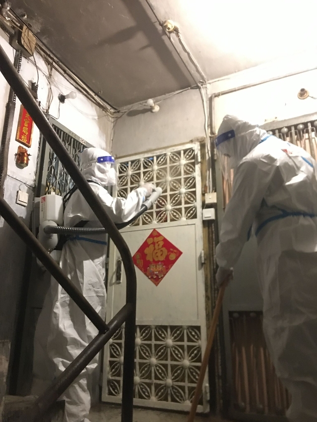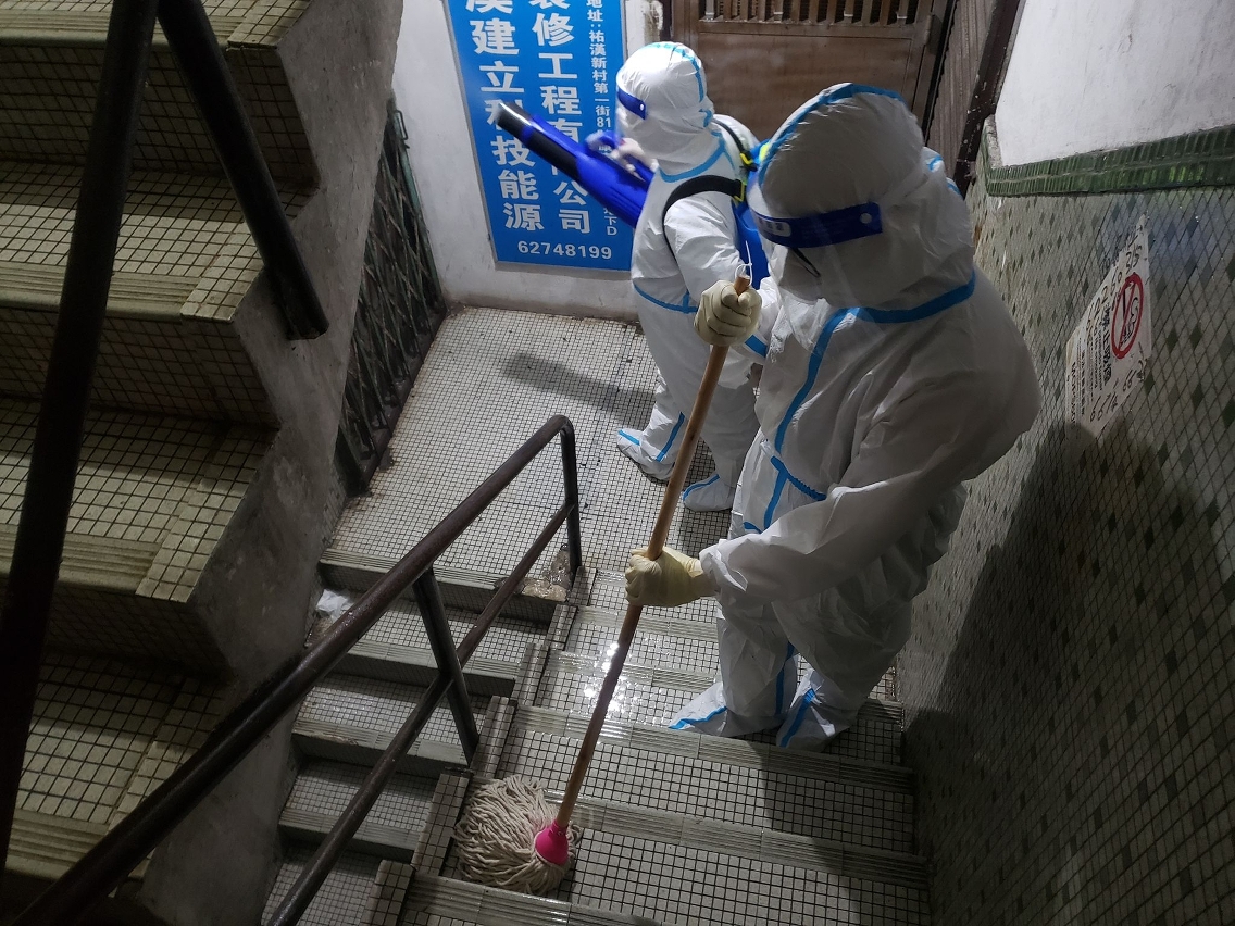早上,維生小組對新增紅碼區康泰樓進行住戶排查及派送物資。市政署於凌晨已對康泰樓的公共空間進行大型清潔及消毒工作,以及在防控區內搭建臨時核酸採樣站及前線協調站。如對防疫措施有任何查詢,可致電新型冠狀病毒感染應變協調中心查詢熱線28700800。