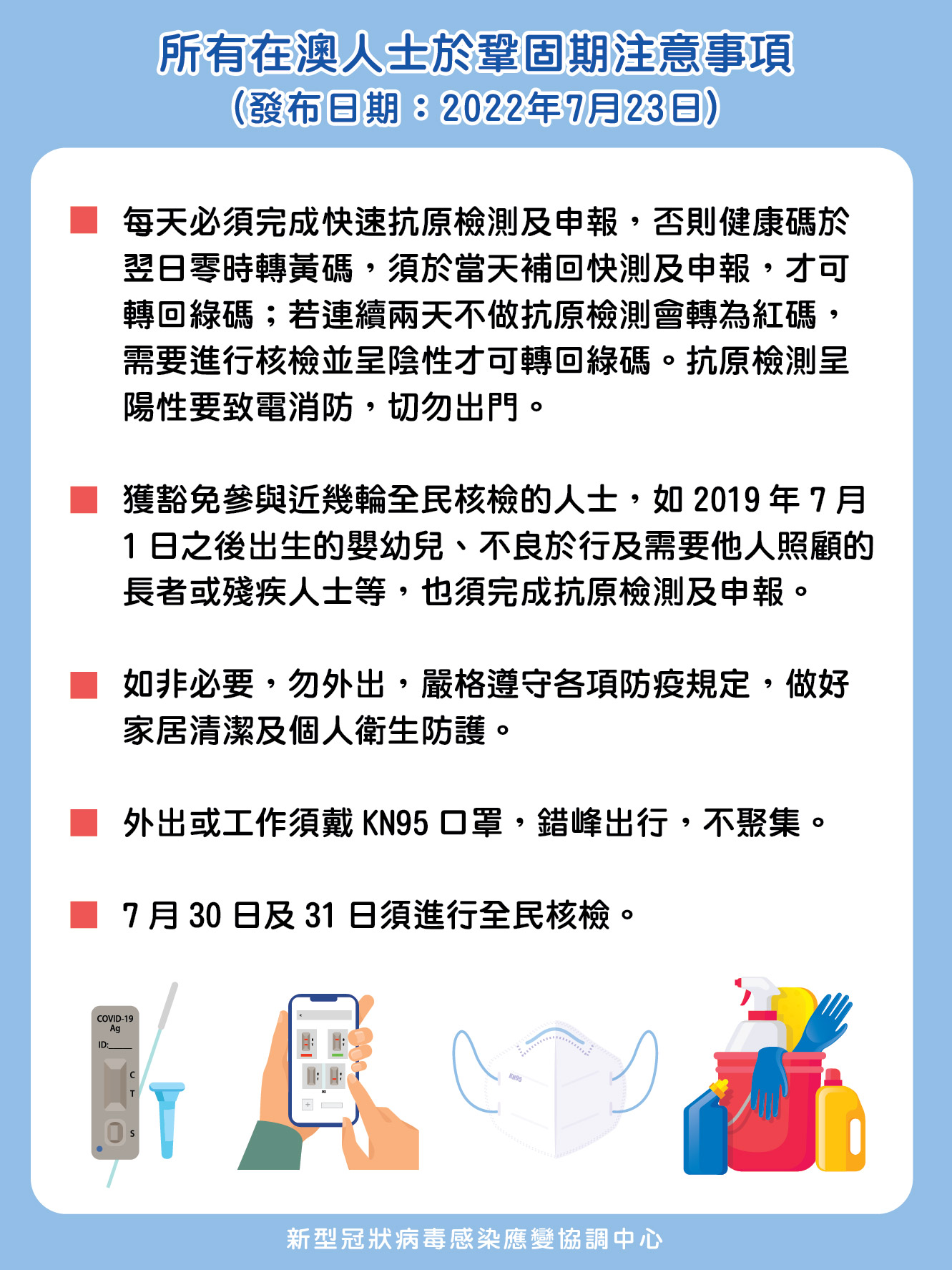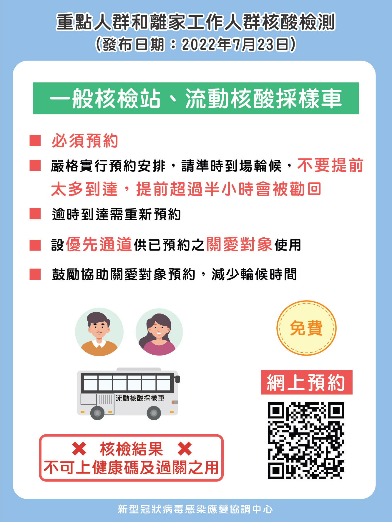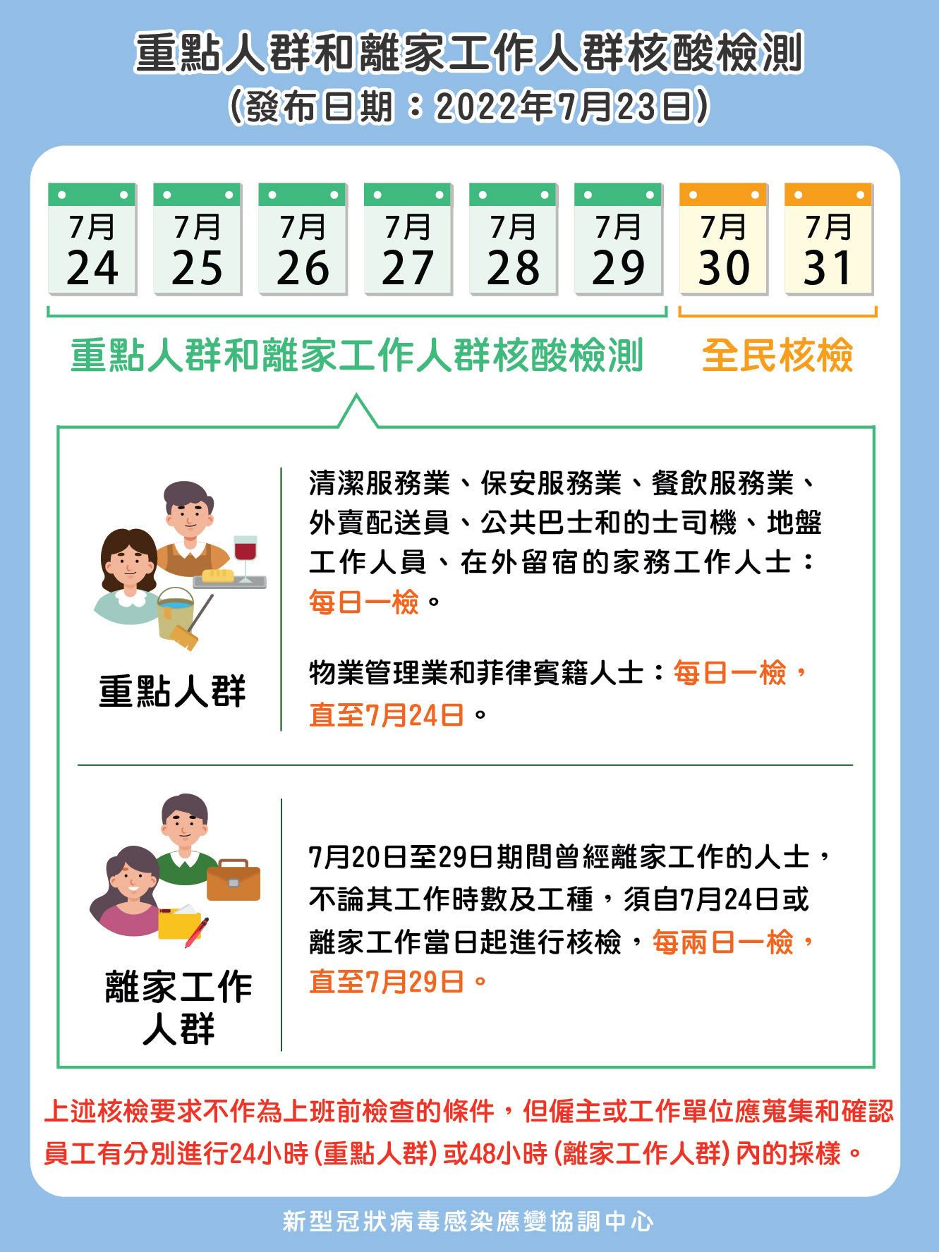 新型冠狀病毒感染應變協調中心(下稱應變協調中心)宣佈,為配合“鞏固期”,7月24日(星期日)至29日(星期五)一連6日,將開展重點人群和離家工作人群核酸檢測:重點人群須每天進行1次核酸檢測,而離家工作人群則須每2天進行1次核酸檢測。