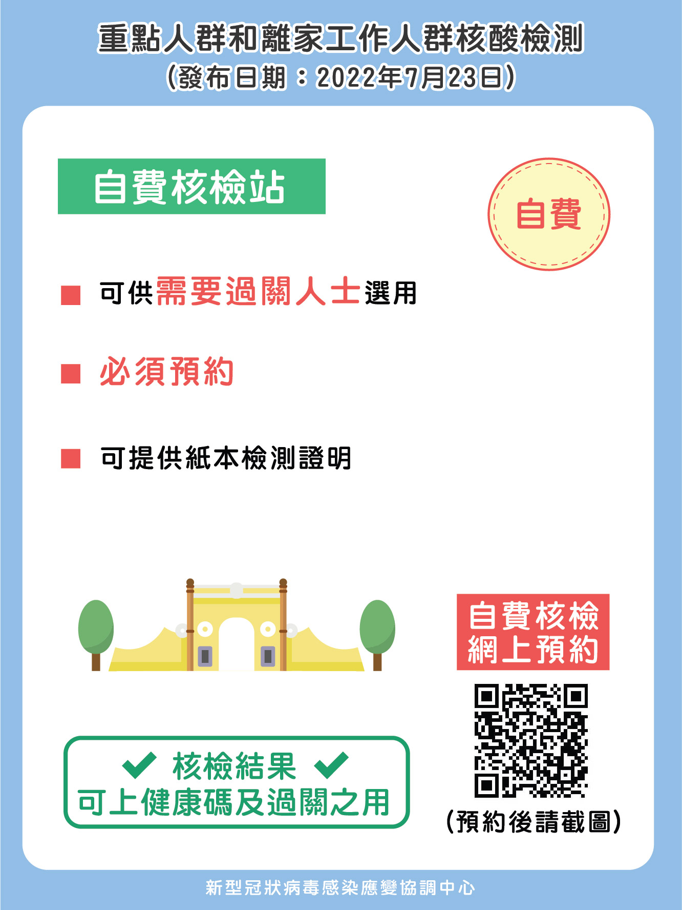 設2個自費核檢站(必須預約),預約連結為https://eservice.ssm.gov.mo/rnatestbook/V21/ 或https://app.ssm.gov.mo/kkhtbook。可提供紙本檢測證明,核檢結果可上健康碼並用作通關,且可視為重點人群/離家工作人群核檢結果。