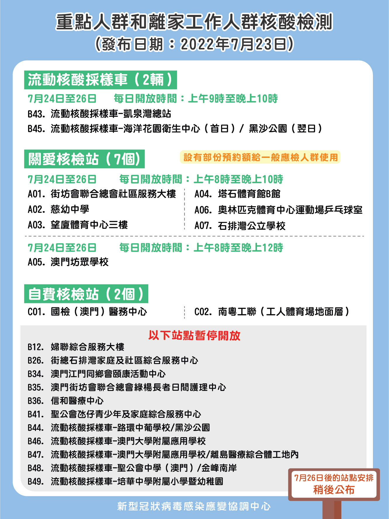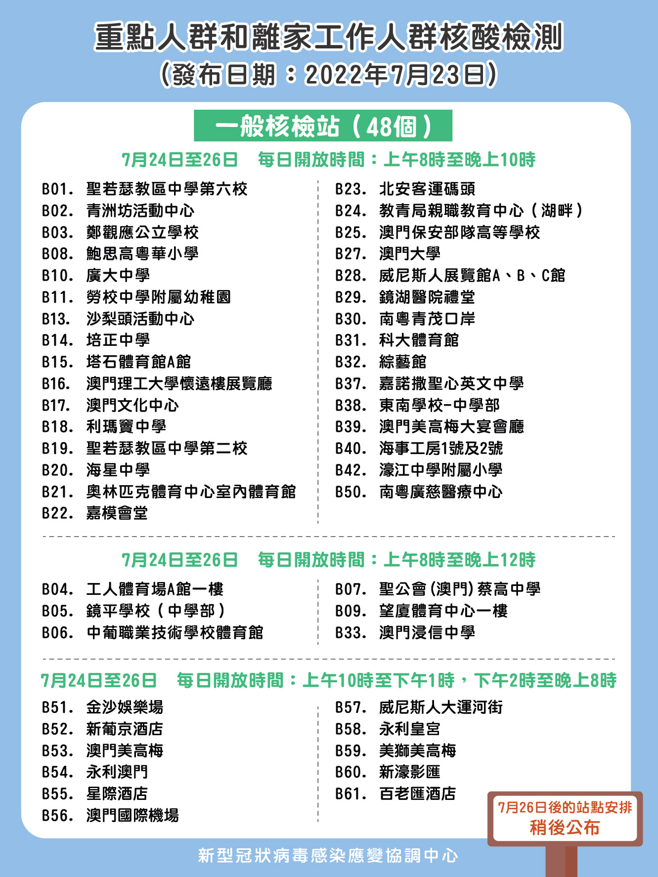 此外,將按疫情和復工情況,不斷調整站點數量和開放時間,並會適時公佈7月26日之後的核檢安排,敬請居民留意。