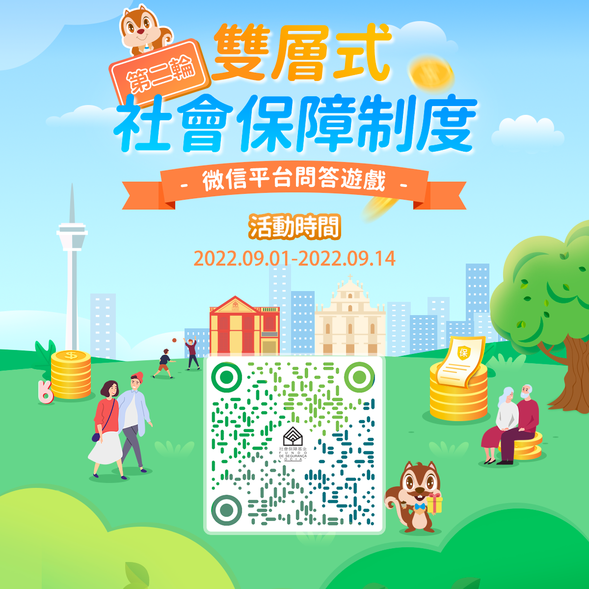 為讓居民更深入了解雙層式社會保障制度內容,社會保障基金舉辦微信平台問答遊戲,參加者掃描海報二維碼,或關注“澳門社會保障基金”微信公眾號後,即可透過菜單進入遊戲,回答5條隨機抽出的、與第二層非強制性中央公積金制度相關問題,答案正確可參與抽獎,每人每天有2次進行遊戲及抽獎的機會。