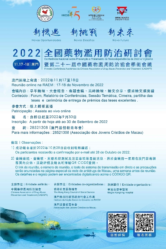 由中國藥物濫用防治協會主辦、澳門特別行政區政府社會工作局、香港社會服務聯會及澳門基督教青年會合辦的“2022年全國藥物濫用防治研討會”,將於11月17至18日在浙江省寧波市舉行,港澳地區將以線上形式參會,現正接受報名。