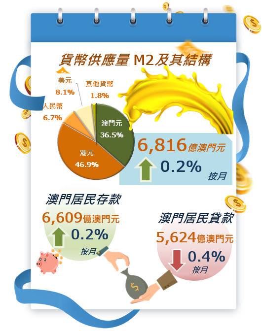 流通貨幣上升1.3%,而活期存款則下跌3.6%,M1因而較上月減少2.2%。另一方面,準貨幣負債增加0.5%,因此包括M1及準貨幣負債的廣義貨幣供應量M2遂按月上升0.2%,金額為6,816億澳門元。若與2021年同期比較,M1及M2分別下跌6.3%及1.2%。按幣種分析,澳門元、港元、人民幣及美元在M2的比重分別為36.5%、46.9%、6.7%及8.1%。