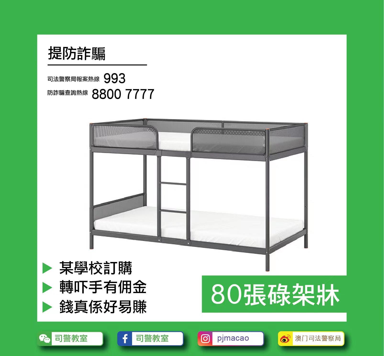 司法警察局接獲騙案,騙徒假冒本澳某學校職員,致電家具店訛稱需要訂購大量雙層床及床墊,其後,騙徒要求家具店向指定的假供應商訂購床墊,更稱家具店可從中抽取回佣。事主透過轉帳方式支付訂金後,致電該學校查詢得悉並無訂購一事,並與騙徒及假供應商失去聯絡,隨即報案求助。