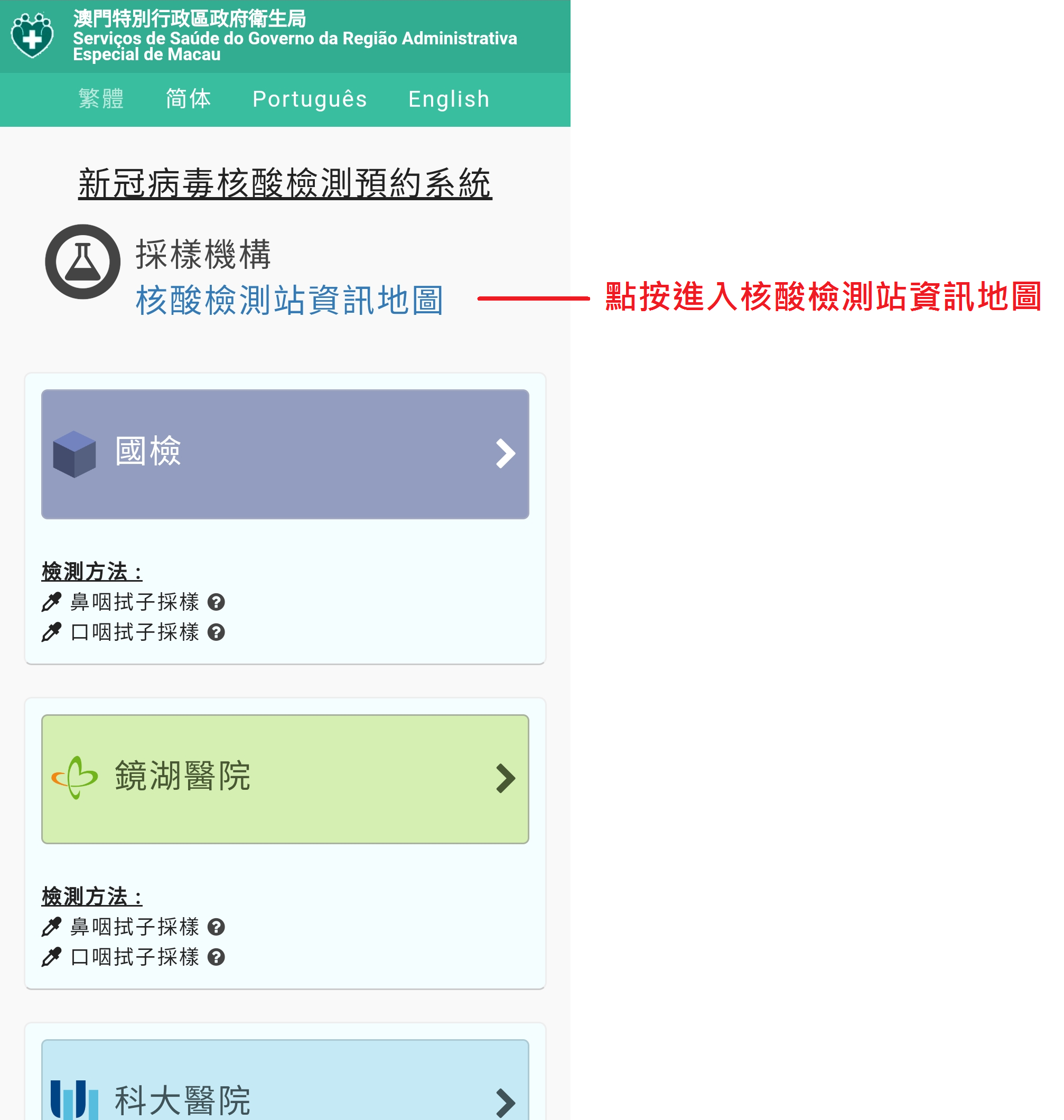 1. 使用者可點按新冠病毒核酸檢測預約系統主頁上方連結或直接使用以下連結進入地圖:https://app.ssm.gov.mo/rnastation/map;(附圖一)