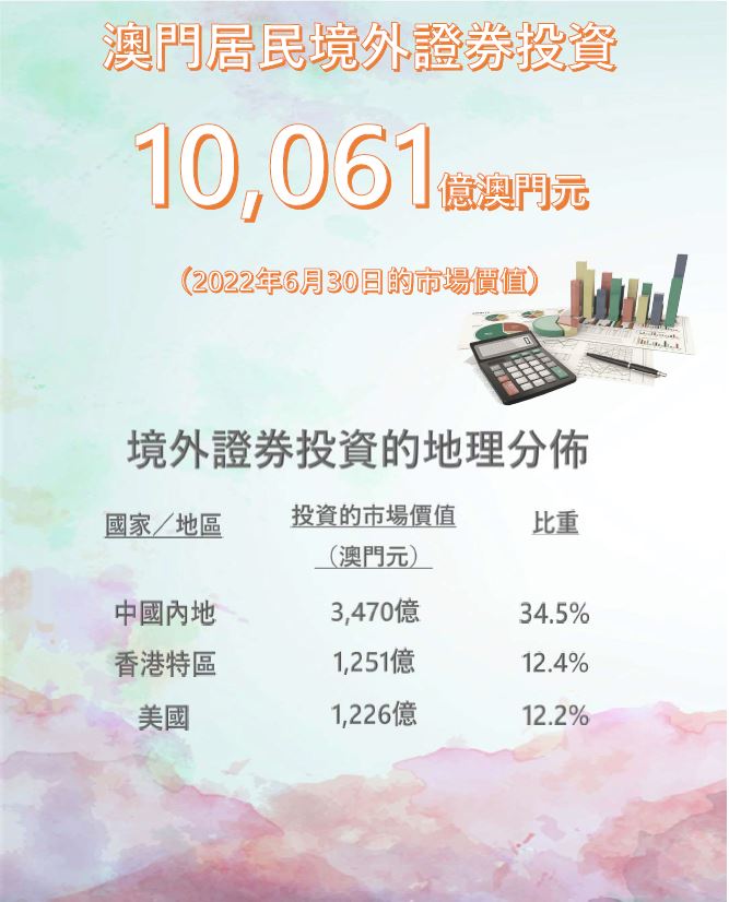 投資於中國內地實體發行的證券(包括在中國內地以外交易所上市的證券)繼續處於領先位置,佔澳門居民境外證券投資的34.5%,其市值達3,470億元,較2021年底下跌12.9%;當中,投資在股權證券、長期債券及短期債券的市值分別為1,205億元、1,951億元及314億元,依次佔相關投資工具類別的36.3%、31.3% 及62.1%。另一方面,投資於香港特區實體發行的證券比重由12.2% 增加至12.4%,惟相關市值下降6.8% 至1,251億元;其中,股權證券及長期債券的投資市值分別為520億元和643億元。