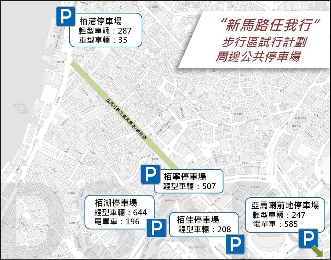 配合文化局於12月24日、25日、31日及明年1月1日舉辦的“新馬路任我行”步行區試行計劃,12月24日上午8時至25日晚上11時59分,以及12月31日上午8時至2023年1月1日晚上11時59分,介乎巴素打爾古街與龍嵩正街之間的一段新馬路(亞美打利庇盧大馬路)及周邊部份道路實施封閉交通,部份路段則設為允許特許車輛通行路段,以方便公共及緊急服務車輛維持服務(詳見附表)。而為保障車輛進出新馬路東西兩則道路,快艇頭街、果欄街、關前後街及介乎新填巷與紅窗門街之間一段福隆新街將實施反方向行車。