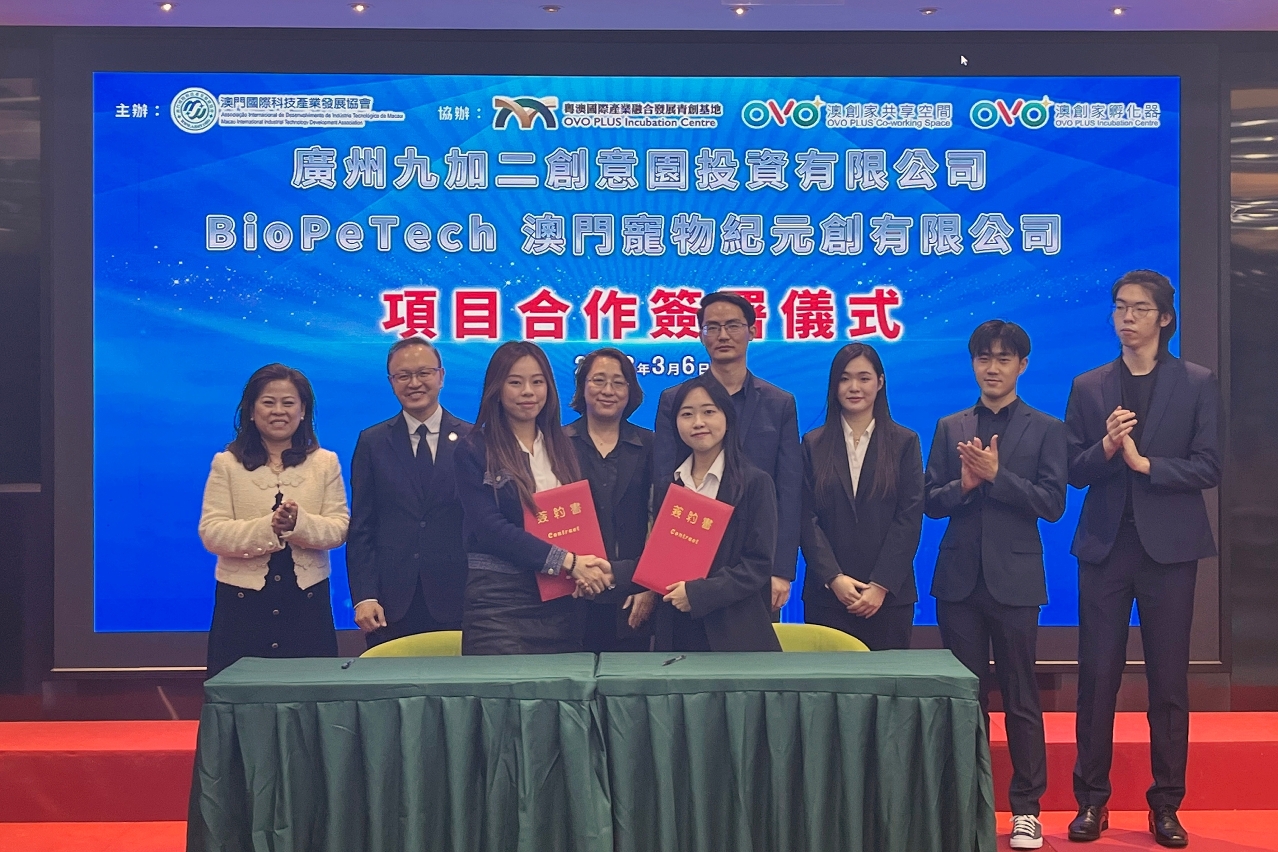 在南沙區委統戰部分管日常工作副部長邱靜慧、區人社局副局長萬政東、澳大鄭裕彤書院院長黃承發見證下,雙方於澳門國際科技產業發展協會(澳創家共享空間)的“南沙青創就業社會保障政策”宣講會上簽署合作協定,澳大書院創業團隊——澳門寵物紀元有限公司創始人譚佩詩、唐敏、付昊明和王正浩出席,並由譚佩詩代表簽署。付昊明認為,簽訂合作意向意味著雙方就團隊未來在南沙區的發展達成了長期穩定的共識,有助團隊整合大灣區商業資源,提升研發與生產能力,將創意和成果推向市場。