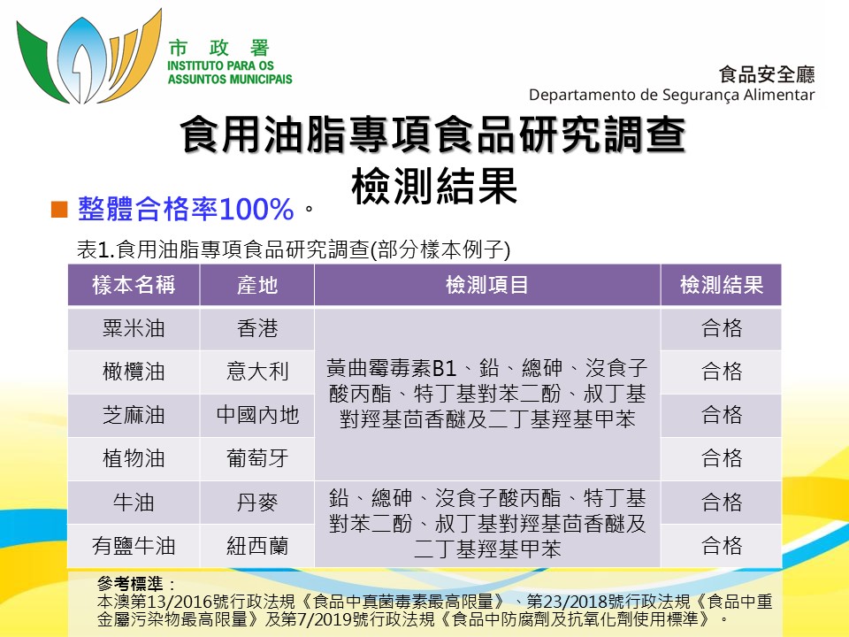 本澳市售食用油脂種類繁多,產地來源廣泛。若食用油脂在原料採收、加工、包裝、運輸或貯存等過程中未能嚴格把關,有機會受到重金屬及黃曲霉毒素B1污染,或含有過量的食品添加劑。為此,市政署開展了食用油脂專項食品研究調查,於本澳超級市場、百貨公司等銷售場所抽取橄欖油、粟米油、花生油、芝麻油、牛油等,合共一百五十個食用植物、動物油脂樣本,進行重金屬鉛及總砷,食品添加劑沒食子酸丙酯、特丁基對苯二酚、叔丁基對羥基茴香醚及二丁基羥基甲苯,以及真菌毒素黃曲霉毒素B1檢測。調查結果顯示,所有樣本均未見異常。