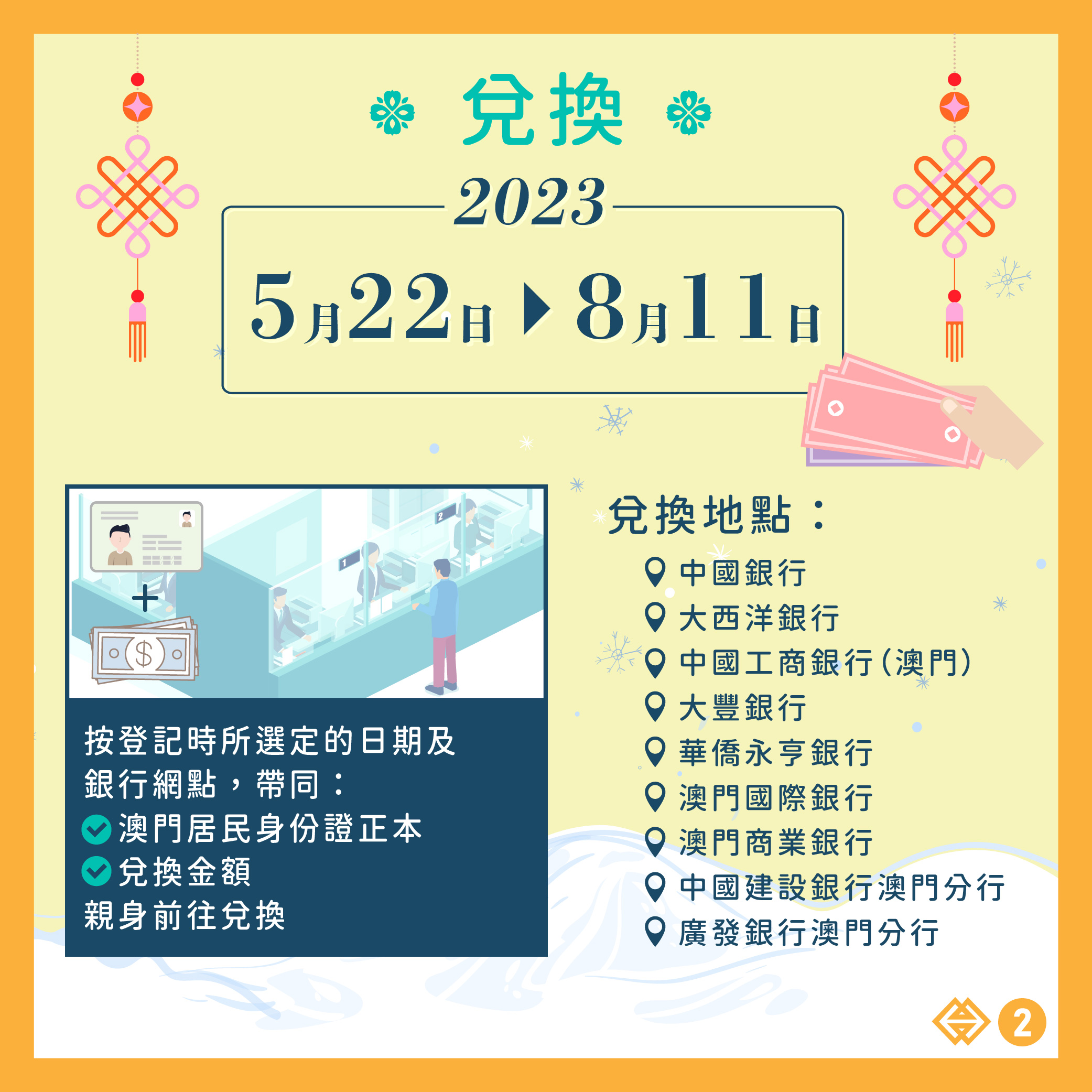 經確認實際登記人數後,每名已登記的澳門居民可兌換每家發鈔銀行發行的壬寅虎年和癸卯兔年生肖鈔各30張、中國銀行早前已發行的第24屆冬奧鈔票4張,即合共可兌換鈔票總數量為124張,兌換所涉及金額為1,280澳門元。