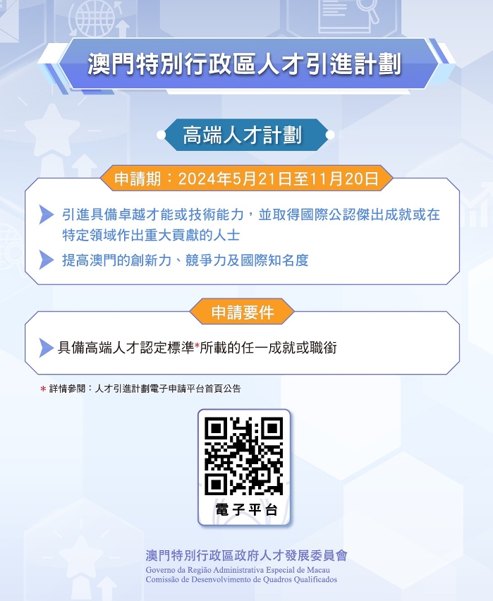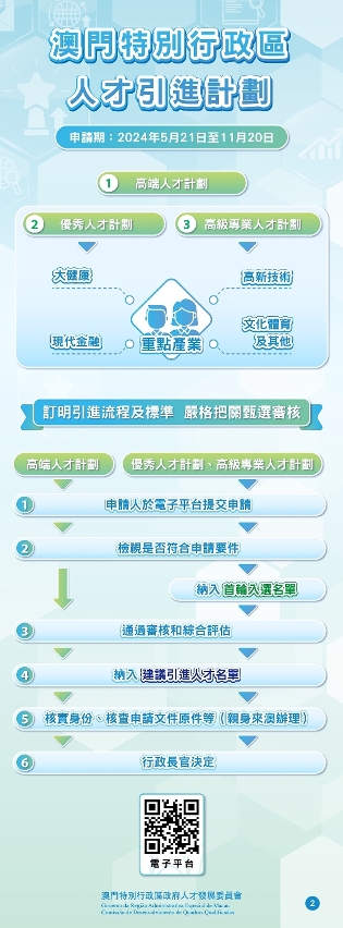 為推動澳門“1+4”經濟適度多元發展,提高澳門的創新力、競爭力及國際知名度,進一步帶動本地產業發展和社會長遠進步,特區政府推出新一期人才引進計劃,於2024年5月21日至11月20日期間接受三類人才,合共九個計劃的申請,包括﹕高端人才計劃、以及分別與大健康產業、高新技術產業、現代金融產業、文化體育及其他產業相關的四個優秀人才計劃和四個高級專業人才計劃。