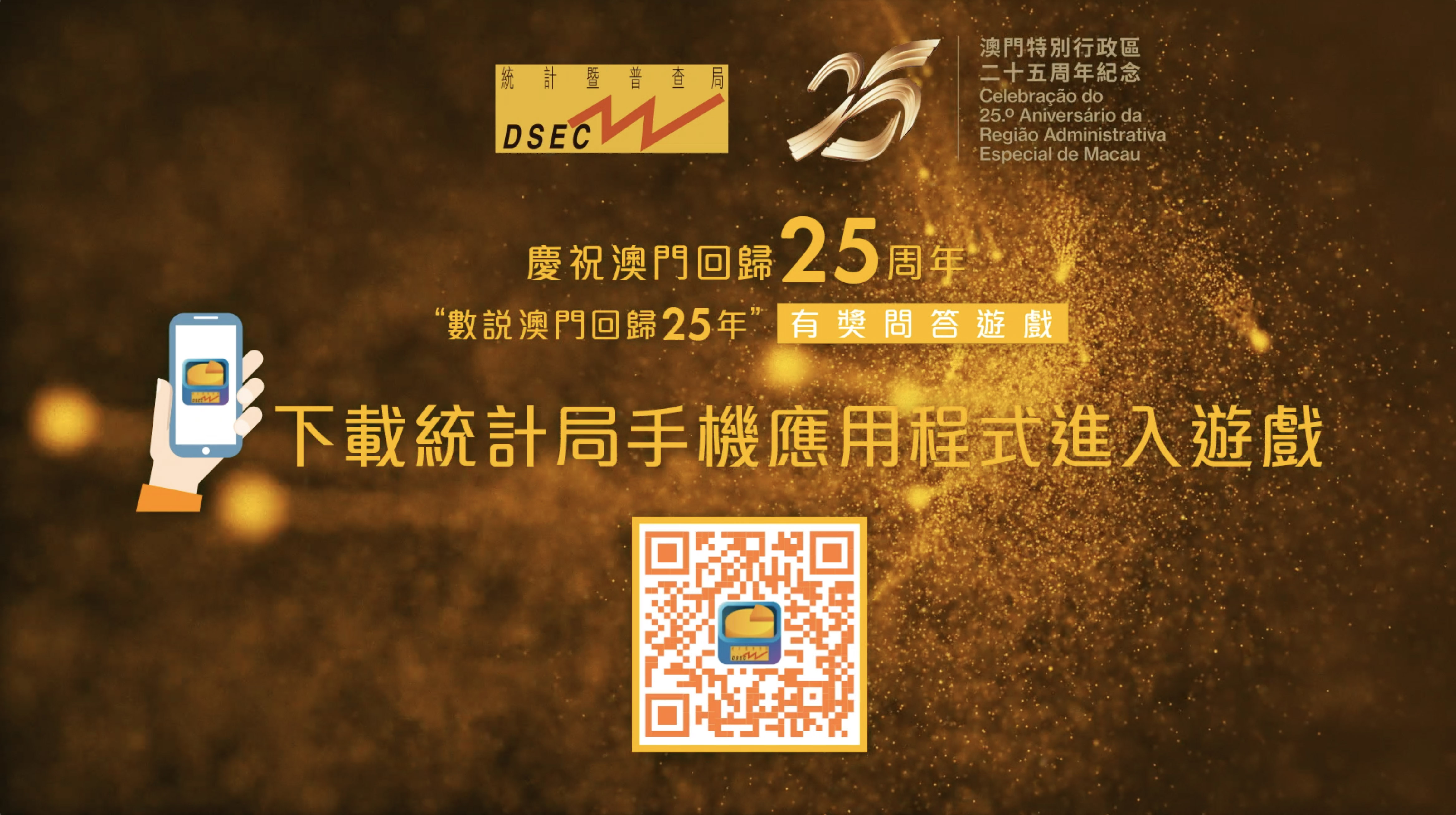 為慶祝澳門特別行政區成立二十五周年,統計暨普查局舉辦“數說澳門回歸25年”有獎問答遊戲與市民共賀回歸,冀讓大眾透過遊戲中的統計數據了解澳門回歸以來社會及經濟等方面的發展與變化。