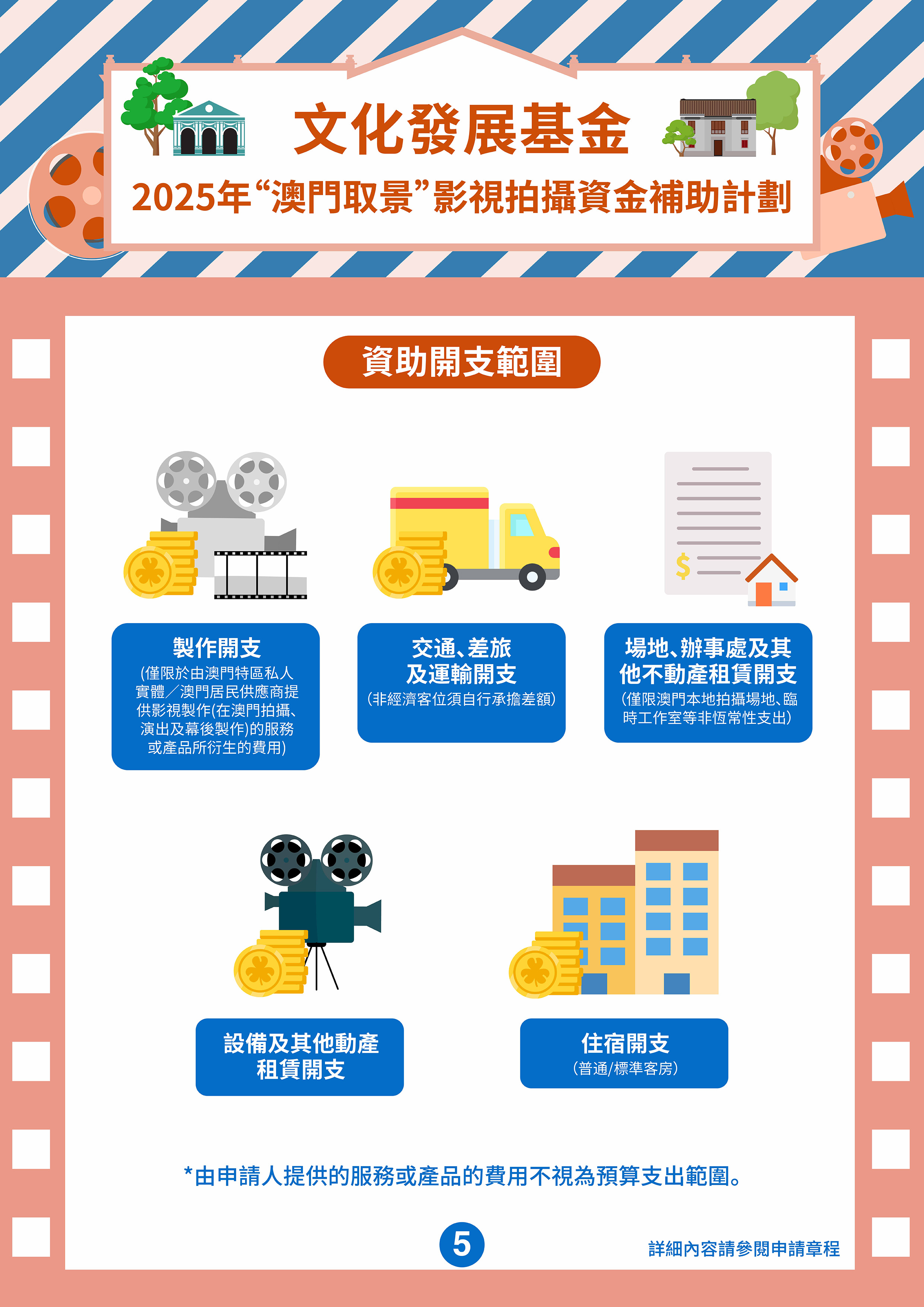 今年將推出四輪申請,第一輪申請期由2025年2月28日至3月31日,倘預算使用完畢,則申請期提早結束。資助計劃接受在確認提交申請日前尚未開展在澳門取景拍攝工作,且在澳拍攝的日數不少於3天的外地影視項目,由外地拍攝團隊主導並來澳參與拍攝工作。資助申請須由作為澳門製片單位的澳門商業企業主提出,其所營事業須與影視製作相關。獲資助的影視項目須在資助期內完成公開播放,且公映版本的片長及片中出現澳門取景地點的時長,須符合章程規定的時限要求。