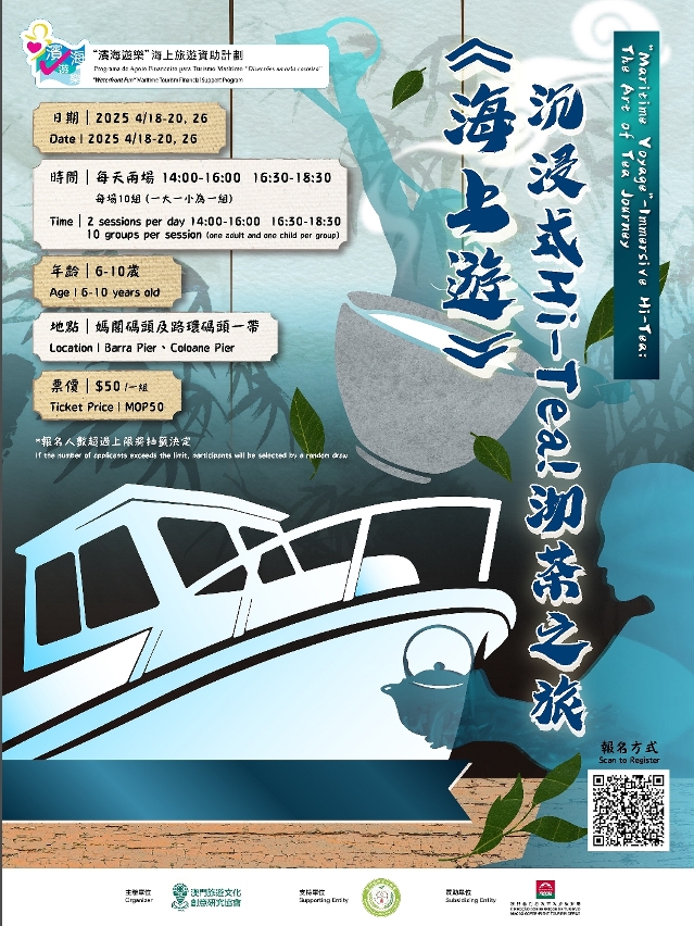“《海上遊》─ 沉浸式Hi – Tea!沏茶之旅”於4月18日、19日、20日和26日舉行,茶藝導師將在觀光船上指導參加者體驗茶藝,觀光船從媽閣碼頭出發抵達路環碼頭後,說書人會帶領參加者走訪路環聖方濟各聖堂等歷史景點,了解澳門故事。此活動之參加者將獲發路環舊城區一帶商戶的折扣券,吸引參加者在活動期間用餐及消費,提高商戶的客流量和知名度。