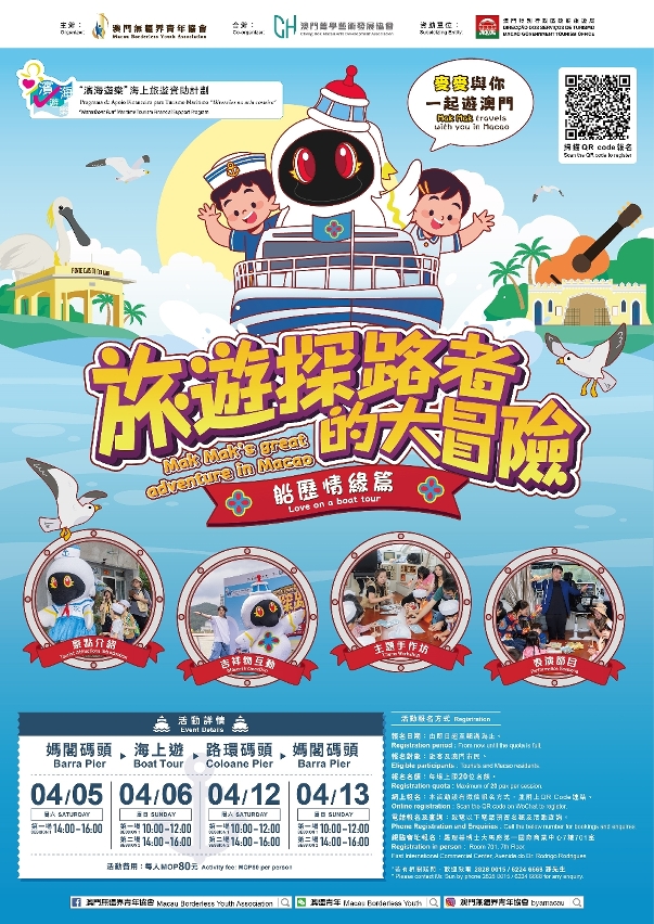 “旅遊探路者的大冒險_船歷情緣篇”於4月5日、6日、12日和13日舉行,以旅遊吉祥物“麥麥”的探險遊歷作主軸,帶領參加者穿梭媽閣碼頭至路環碼頭的濱海路線,在路環碼頭泊岸及參觀路環三聖宮、路環電力廠原址、恩尼斯總統前地,了解澳門歷史故事,並透過互動遊戲、主題手作,豐富旅遊體驗。