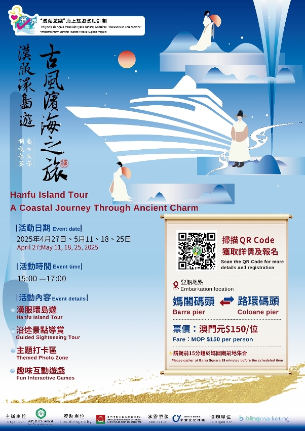 “漢服環島遊 – 古風濱海之旅”於4月27日、5月11日、18日及25日舉行。參加者將於媽閣碼頭登船,穿著漢服在船上體驗互動遊戲及品嚐甜品,更特別安排在木糠布甸上寫書法等趣味活動;導遊亦會沿途介紹澳門的歷史文化以及中葡文化交融的魅力。活動中派發“澳門航海旅遊手冊”,參加者在活動期間可感受航線沿途景點和獲取商戶推出專屬的優惠或折扣,從而促進商戶客流和社區消費。