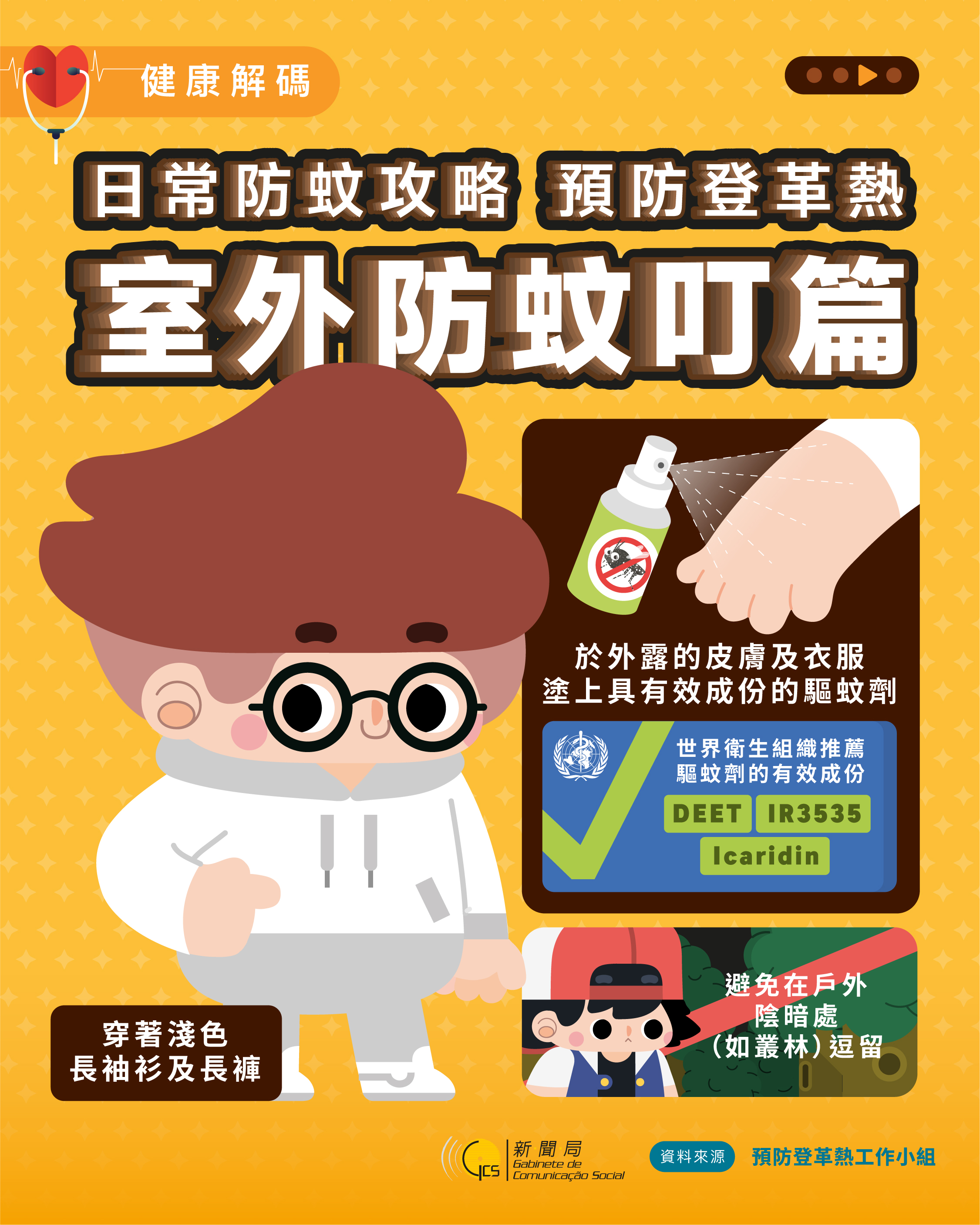 工作小組將持續密切留意澳門鄰近地區的登革熱流行情況,以作充分應對準備。基於今年登革熱傳播風險較高,工作小組已制定一系列巡查孳生源及滅蚊等工作,並以深入社區的活動方式向市民宣傳預防登革熱的訊息,冀共同做好環境清潔及個人防蚊措施,攜手預防登革熱。