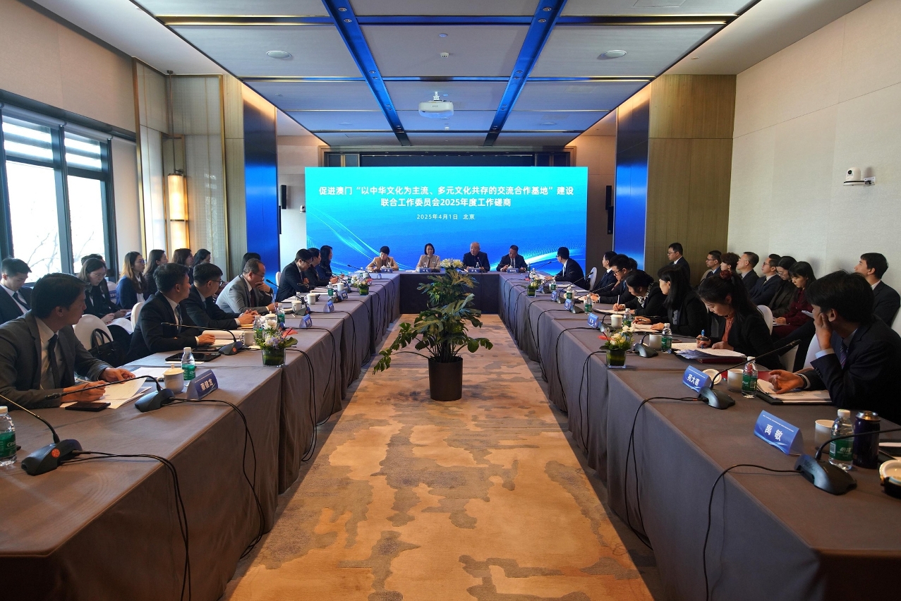 促進澳門“以中華文化為主流、多元文化共存的交流合作基地”建設聯合工作委員會(下稱:聯委會)4月1日在北京召開2025年度工作磋商會議,文化和旅遊部副部長高政、澳門特別行政區政府社會文化司司長柯嵐、中央人民政府駐澳門聯絡辦公室副主任黃柳權及中共中央港澳工作辦公室二級巡視員許麗等出席,會議回顧2024年“一基地”建設的工作成果,並就未來拓展內地與澳門文化交流合作進行磋商,並完成簽署《中華人民共和國文化和旅遊部與澳門特別行政區政府關於合作開展中國文化和旅遊海外推廣工作的協議》。