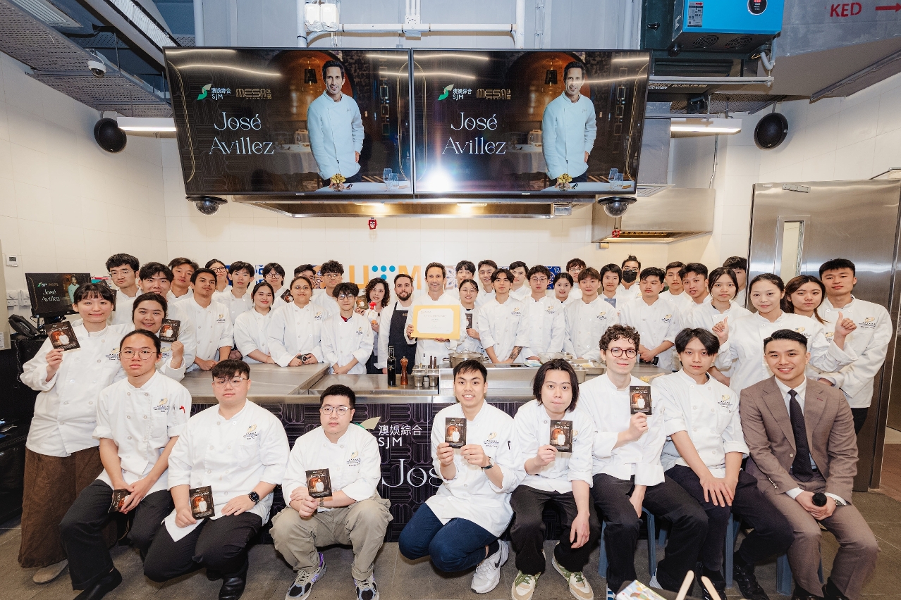 為葡萄牙里斯本摘下首個米芝蓮二星殊榮的Avillez,致力將葡式風味推廣全球,現時主理澳門上葡京綜合度假村“味賞”葡國餐廳,為澳門呈獻上乘葡國料理。是次分享會活動上,Avillez主廚分享其廚藝事業歷程及“味賞”餐廳菜式的創作理念,並與學生探討烹飪創新、餐廳營運挑戰,以及商業策略等經驗。Avillez主廚更於現場廚藝示範環節展示其經典名菜“薯絲炒馬介休”,講解菜式演變、烹調技巧,以及現代演繹手法,豐富學生對葡菜的認識,為今後職業生涯積累寶貴經驗。