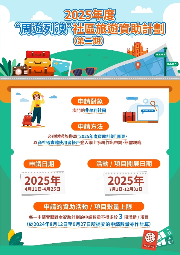 旅遊局2025年度“周遊列澳”社區旅遊資助計劃(第二期)於4月11日至25日接受申請,活動或項目須於2025年7月1日至12月31日期間舉辦,申請可透過商社通帳戶登入旅遊局“2025年度資助計劃”專頁提交。
