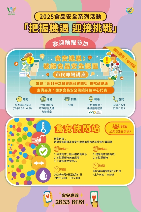 市政署誠邀業界、市民參與系列食安活動,共同提升澳門食安水平、促進產業進一步發展。如對活動有任何查詢,可於辦公時間致電食安專線2833 8181查詢。