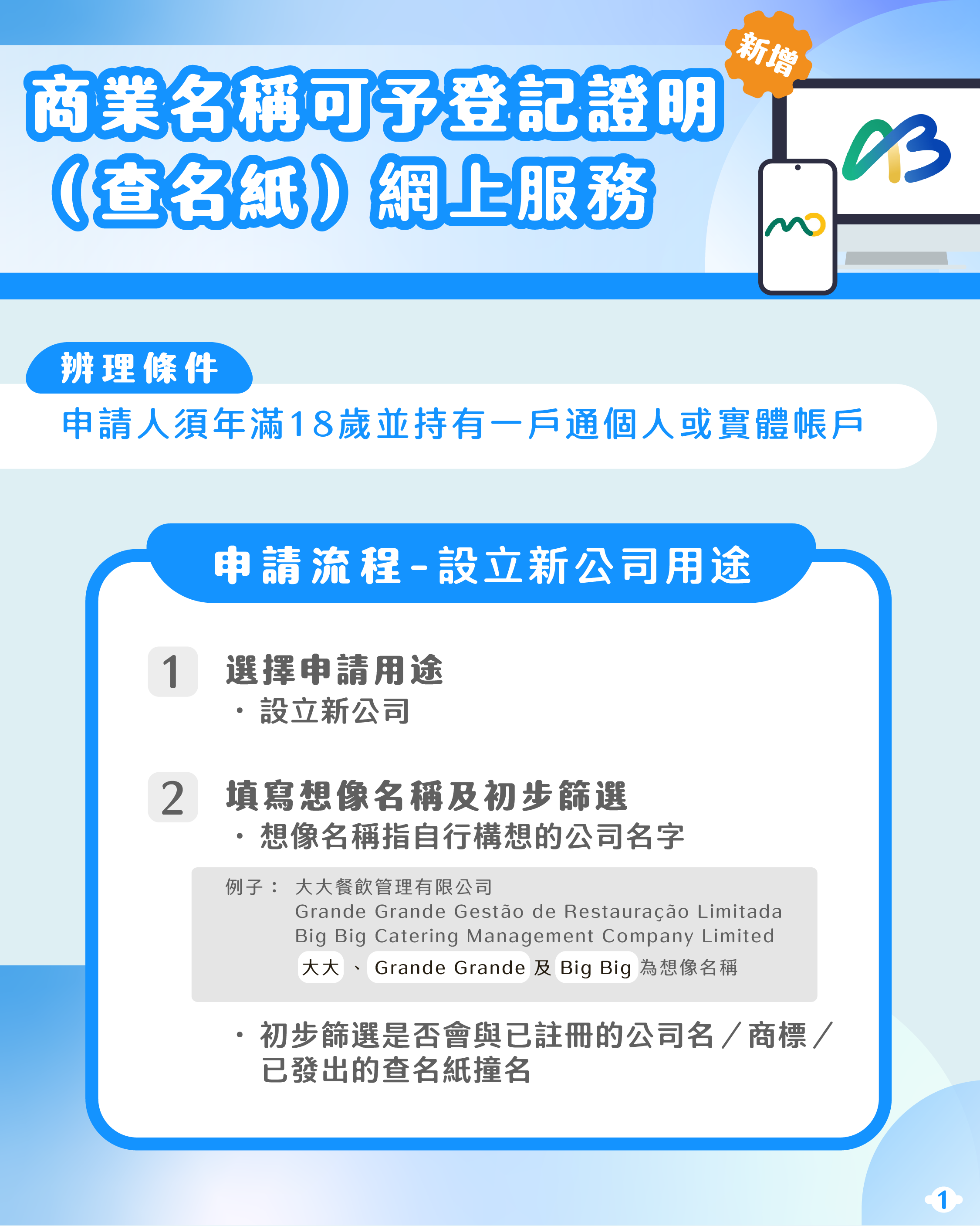 在商業名稱可予登記證明(即查名紙)方面,市民可透過“一戶通”或“商社通”申請查名紙,直接線上提取電子版查名紙或線下領取紙本版,免卻以往市民在設立公司、變更公司名稱或業務前,要親臨登記局申請及領取查名紙,以確認擬採用的商業名稱(公司名)可予以登記。